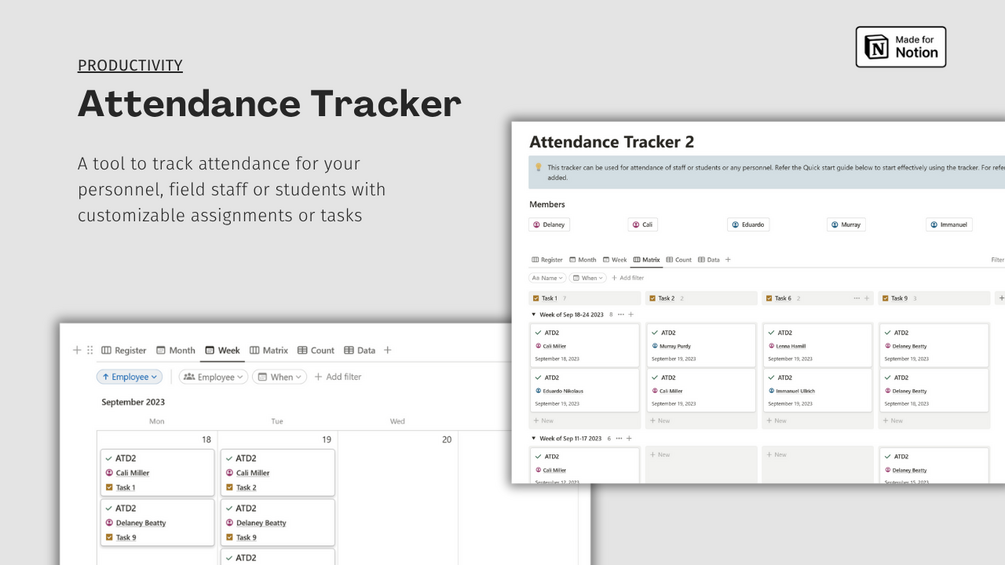 - Data Visualization: Visualize attendance data using Monthly, Weekly or Matrix views directly within Attendance Tracker. Gain a deeper understanding of attendance trends and patterns by analyzing the data in the dynamic Matrix view.